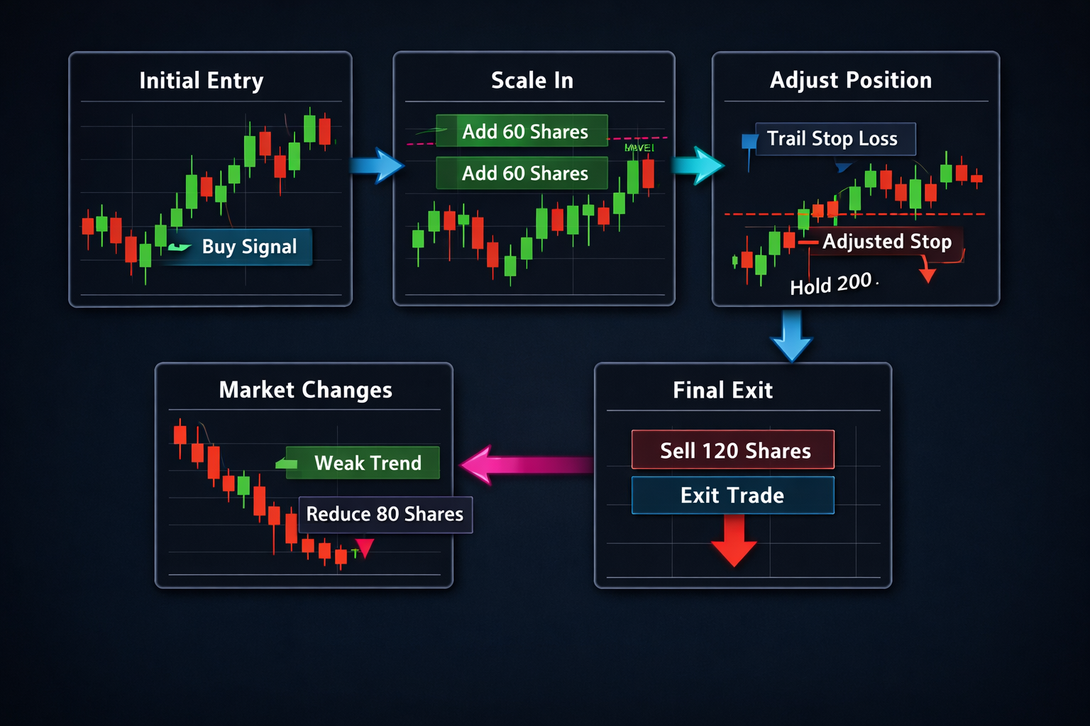 Scaling trades systematically helps manage risk and maximize profits. Imagine entering a trade with 10 shares of XYZ Corp at $50 per share. Instead of holding this fixed position, add to your winning positions gradually.