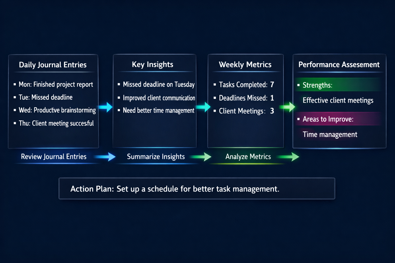 Weekly journal entries also enhance efficiency, saving time during monthly and quarterly reviews by aggregating insights in real-time rather than trying to recall past events. Aggregating Journal Insights