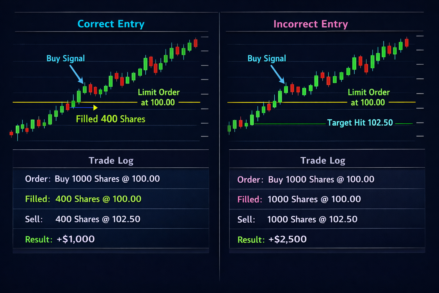 Scenario Example: Suppose you buy 100 shares at $50, then purchase another 50 shares later at $48 due to price movements. The correct entry would document both transactions separately. In contrast, the incorrect approach might only note a single purchase of 75 shares at an average price that doesn’t reflect your actual trades.